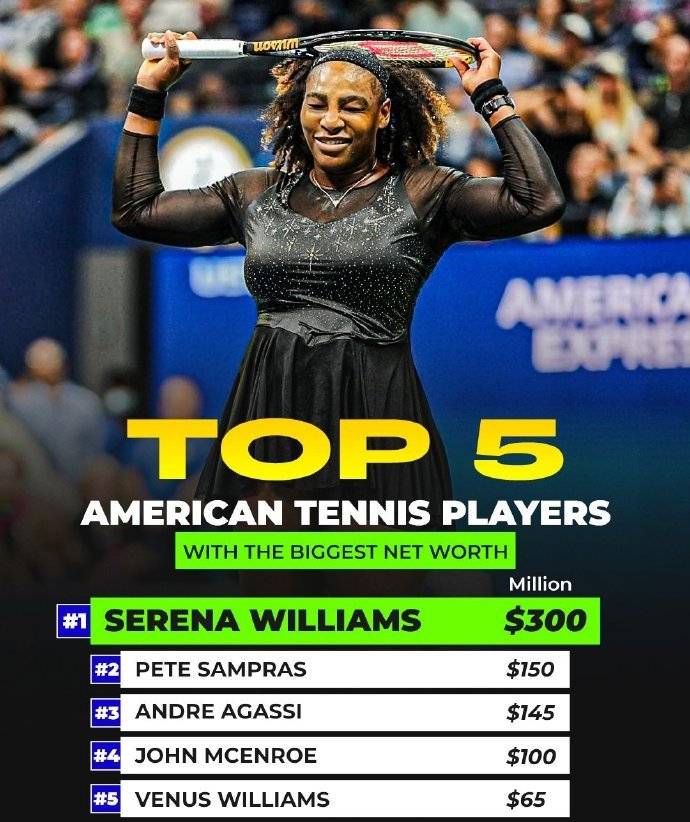 我们再来关注一项数据。有外媒统计了美国最富有的五位网球运动员,他们的身价大多超过1亿美元,美国的大小威姐妹一个位居榜首,一个排在第五位。而排在第二至第四位的是三位男子大神,他们是桑普拉斯、阿加西和麦肯罗。而大小威姐妹的身价总和接近三位大神的总和,可谓阴盛阳衰。五位最富有网球运动员的具体身价如下:
